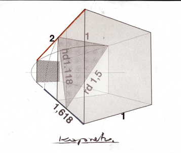 Mit dem Ein-/ Auszug nach Kreuzberg bekam deshalb die Untersuchung der Quadratverdoppelung LC`s zunehmend an Bedeutung: Die geometrische Vorgehensweise seiner Mitarbeiter hielt der mathematischen Nachprüfung nicht stand (siehe oben). Dagegen bot die Heranziehung der wahren Größe der Raumdiagonale ( deren Ansicht die Diagonale der Quadrathälfte ist, mit deren Umklappung die Proportion 1: 1,618 normalerweise geometrisch ermittelt wird ) mit rd= 1,5 (einskommafünf) genau das Maß das + 0,5 (nullkommafünf) zwei ergibt ( siehe Skizze ), ganzzahlig!